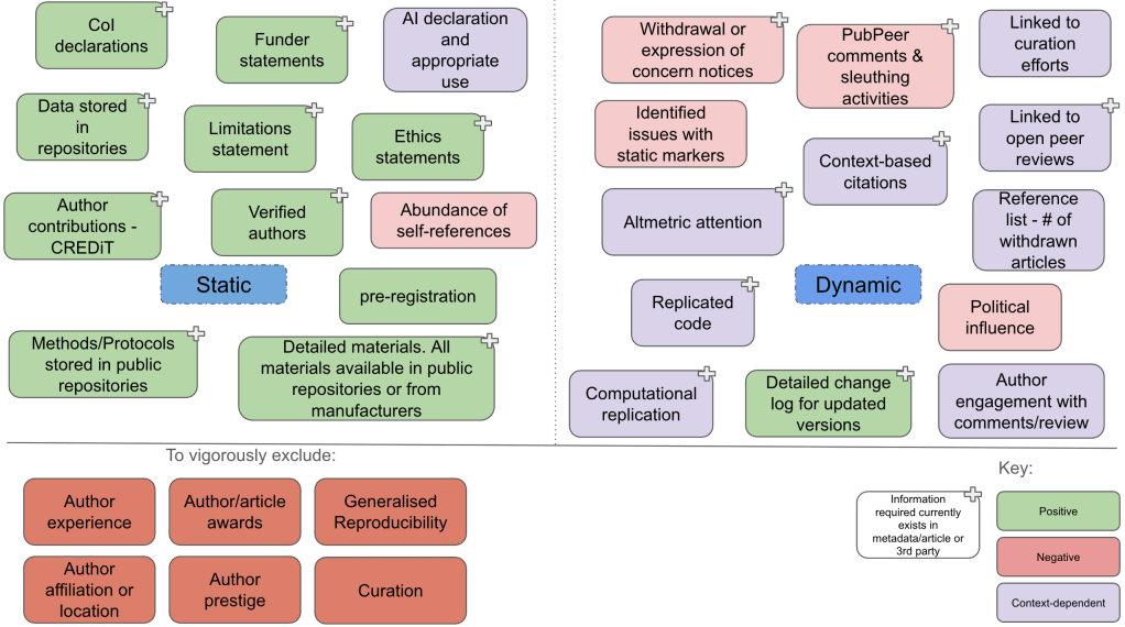 We propose a combination of static and dynamic trust indicators, to incentivise high standards whilst collating post-publication feedback, discussion and use. Static trust indicators are designed to encourage and reward rigorous and open research practices. Dynamic signals are designed to focus on the research itself rather than poor proxies and to help inform readers.